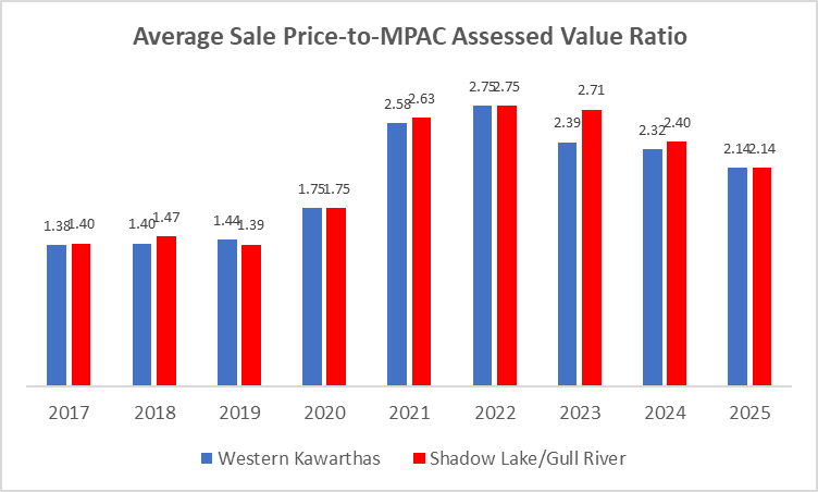 The average Sale Price-to-MPAC Assessed Value Ratio of the 8 Shadow Lake/Gull River sales in 2025 of 2.14 was the lowest since 2021, and this trend of falling prices is consistent with that of the broader western Kawarthas waterfront market since the Covid bubble burst in mid-2022.