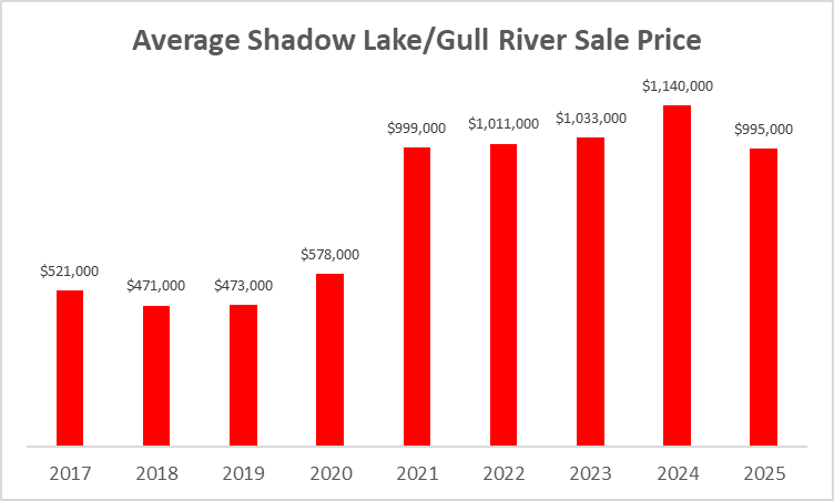 The average Shadow Lake/Gull River sale price of $995,000 in 2025 was down moderately from 2024 but resided near the higher end of the range of average sale prices across the western Kawarthas in 2025.
