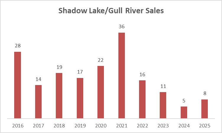 The 8 sales on Shadow Lake/Gull River in 2025 were up from only 5 in 2024 but remained low from a historical perspective, consistent with waterfront sales trends across the western Kawarthas.